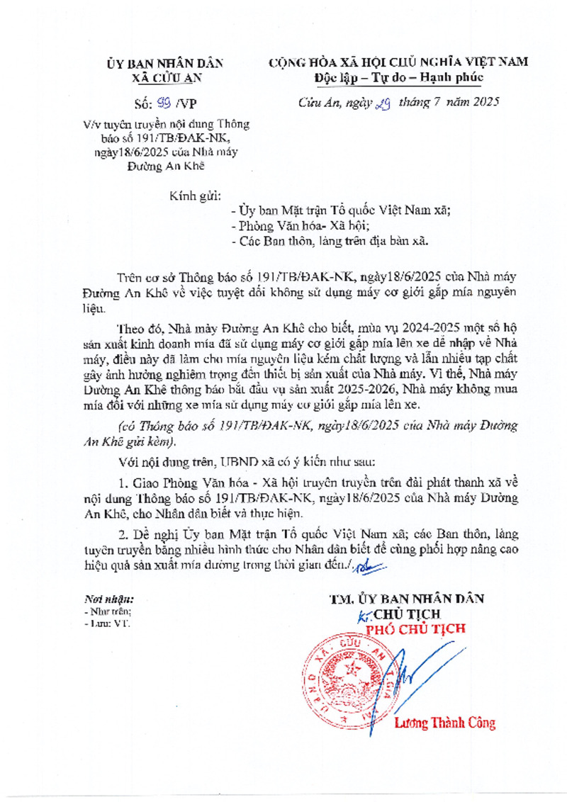 | Tiêu đề văn bản | Công văn tuyên truyền nội dung Thông báo số 191/TB/ĐAK-NK, ngày18/6/2025 của Nhà máy Đường An Khê | ||